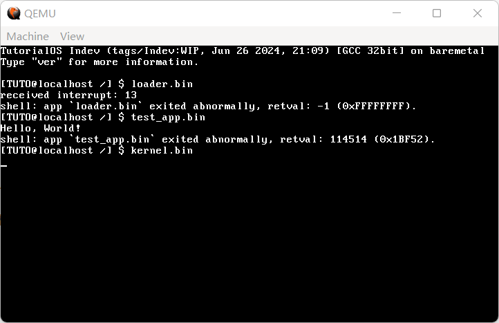 这样一来,在 buf 中存着的就是二进制一样的机器码了,理论上可以直接启动。事实上也的确如此,在 exec.c 中只需修改几行代码,就可以让一个 ELF 跑起来了: