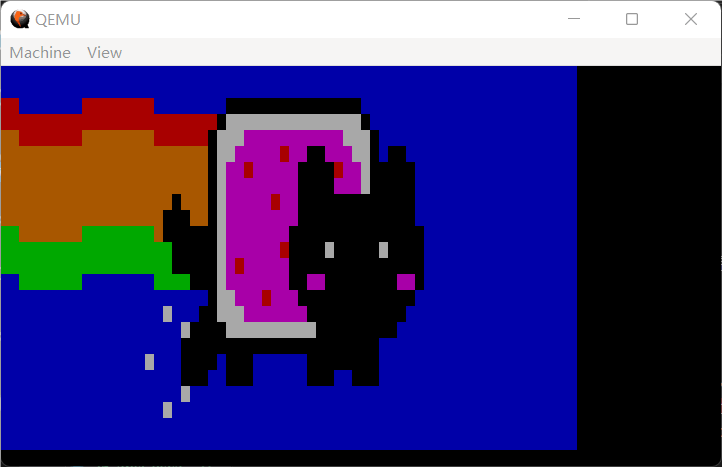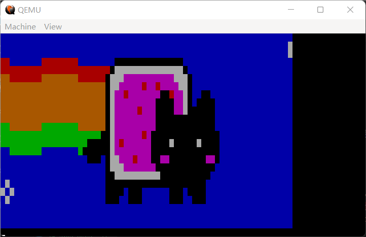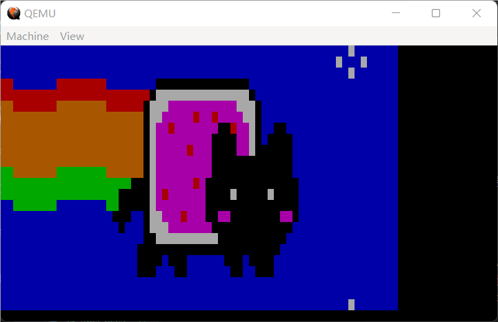 这样简单的测试实在没有挑战性。通过对群友 wenxuanjun 的 os-terminal 的某个测试用例稍加修改,得到了下面的程序:blackcat.c(共 394 行,大部分都是动画,因此就省略放在单独的文件里了)。它本来应该是一个彩虹猫来着,但是由于我们不支持亮色背景色,导致更多人估计只会一眼注意到那个纯黑的猫,所以就从 nyancat 变成了 blackcat